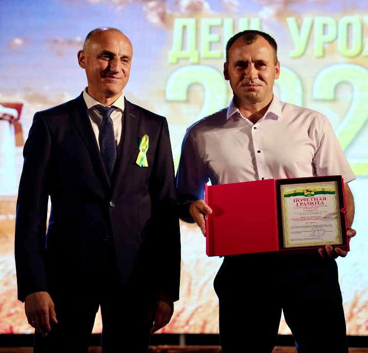 Глава района Анатолий Перепелин наградил почётной грамотой механизатора ООО «Заря» Арама Айряна. Он стал победителем соревнования на жатве в муниципалитете на комбайнах с мощностью силовой установки не более 325 лошадиных сил, намолотив 32706 центнеров зерна.